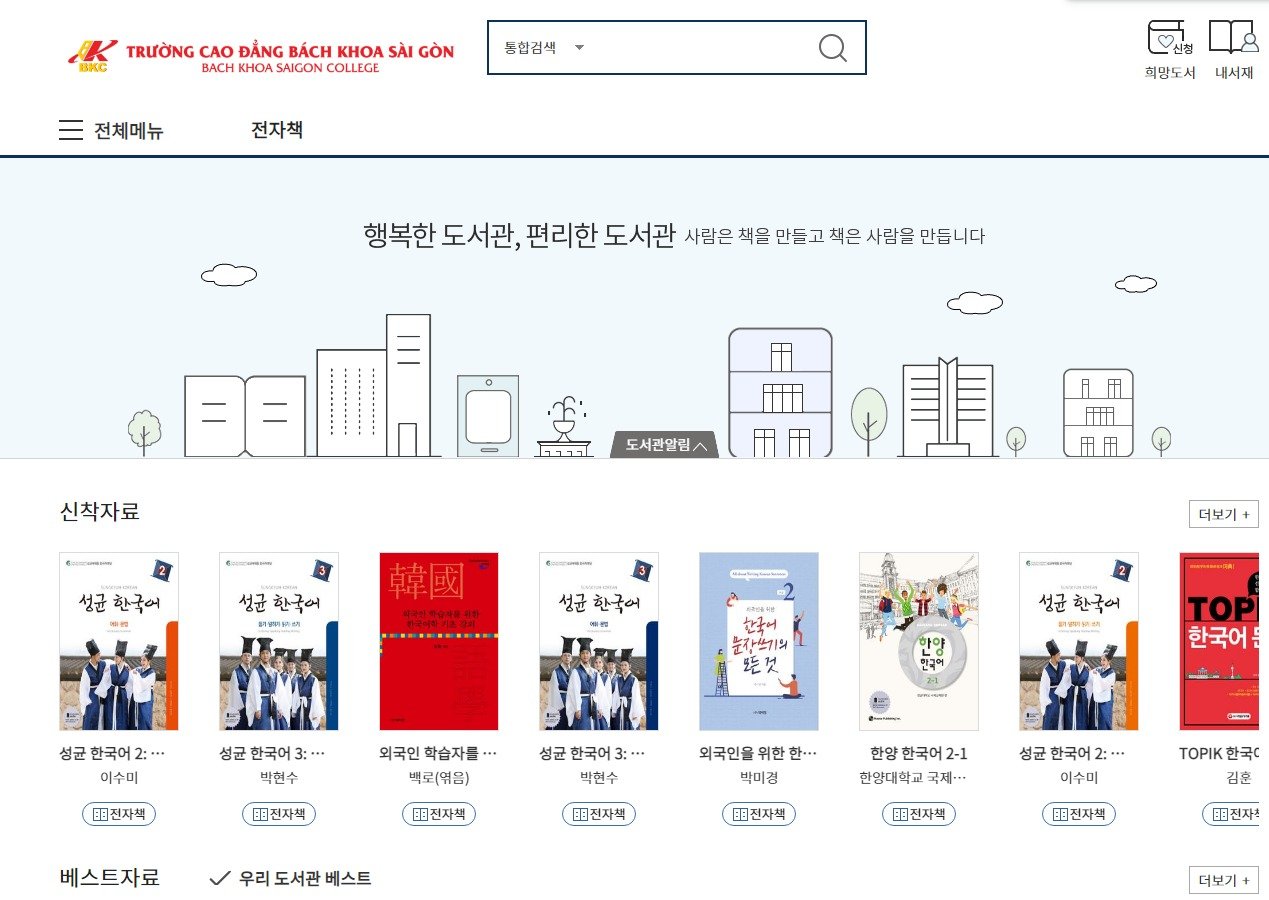 Thư viện BKC thân mời các bạn sinh viên khoa ngoại ngữ (Tiếng Hàn ) truy cập website: https://krbkc.dkyobobook.co.kr/elibrary-front/main.ink đây là trang website có nhiều tài liệu học tiếng Hàn hữu ích. Trân trọng